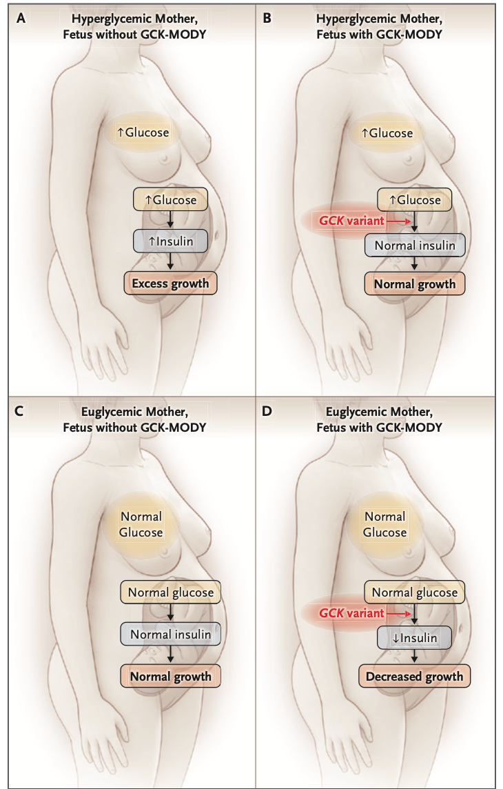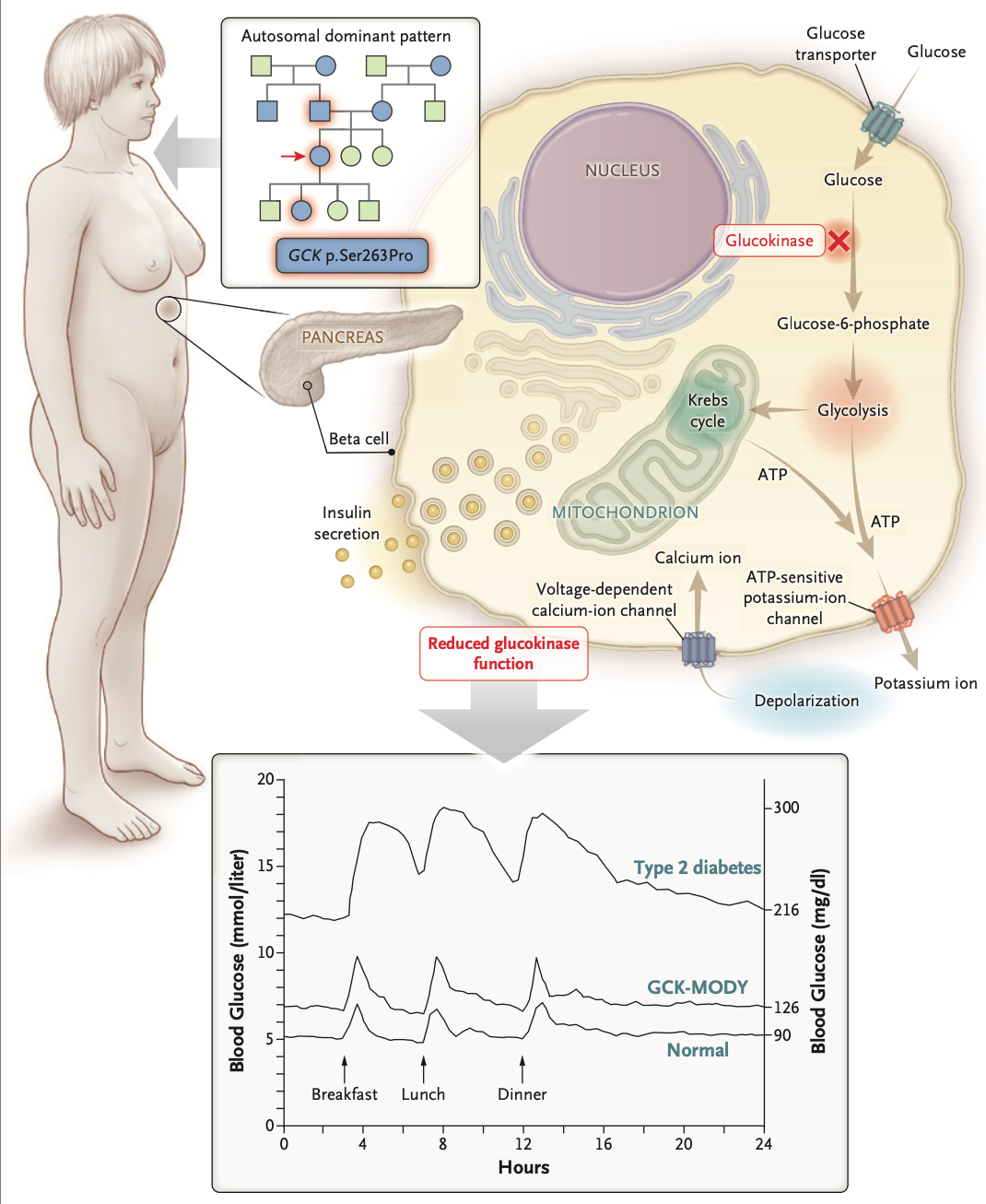 グルコキナーゼ(GCK)は膵臓や肝臓でブドウ糖濃度のセンサーの役割をするとされ、GCK-MODYではインスリン分泌に対する血糖値の閾値が高くなるため、出生時より軽度の空腹時高血糖を呈する。インスリン分泌の閾値以外に糖代謝異常はないため、基本的に血糖値は安定して経過し、HbA1cは高くても7%程度で推移することが多い。基本的に無症状なため検診時(学校の検尿、職場検診)や妊娠糖尿病(1%を占める)として指摘されることが多い。GCK-MODYは2番目に多い原因であり、無症候性の軽度高血糖を呈するため見逃されている症例が多いと考えられる。