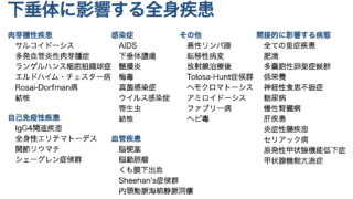 (注4) 一般にT1強調Gd造影画像にて, 正常下垂体と比較して造影されにくい病変として認められる. T2強調単純画像にて, 側頭葉灰白質と比較して低信号の場合, 第一世代ソマトスタチンアナログに感受性の高いdensely granulated tumorsが示唆される. トルコ鞍空洞症候群を伴って下垂体に明らかな腫瘍の所見を認めない場合がある. 稀な原因ではあるが異所性 GHRH産生腫瘍の場合には下垂体は過形成の所見を, 異所性GH産生腫瘍の場合には下垂体は低形成の所見を呈する場合がある.