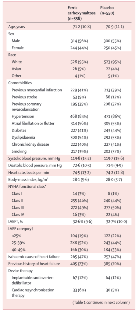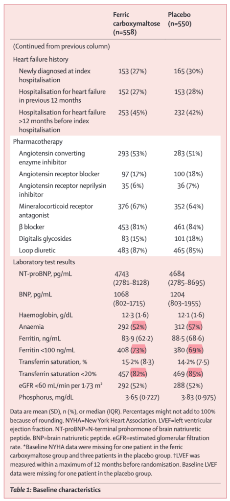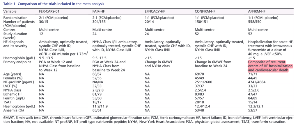Ponikowski P. Ferric carboxymaltose for iron deficiency at discharge after acute heart failure: a multicentre, double-blind, randomised, controlled trial. Lancet. 2020;396:1895-1904. PMID: 33197395.