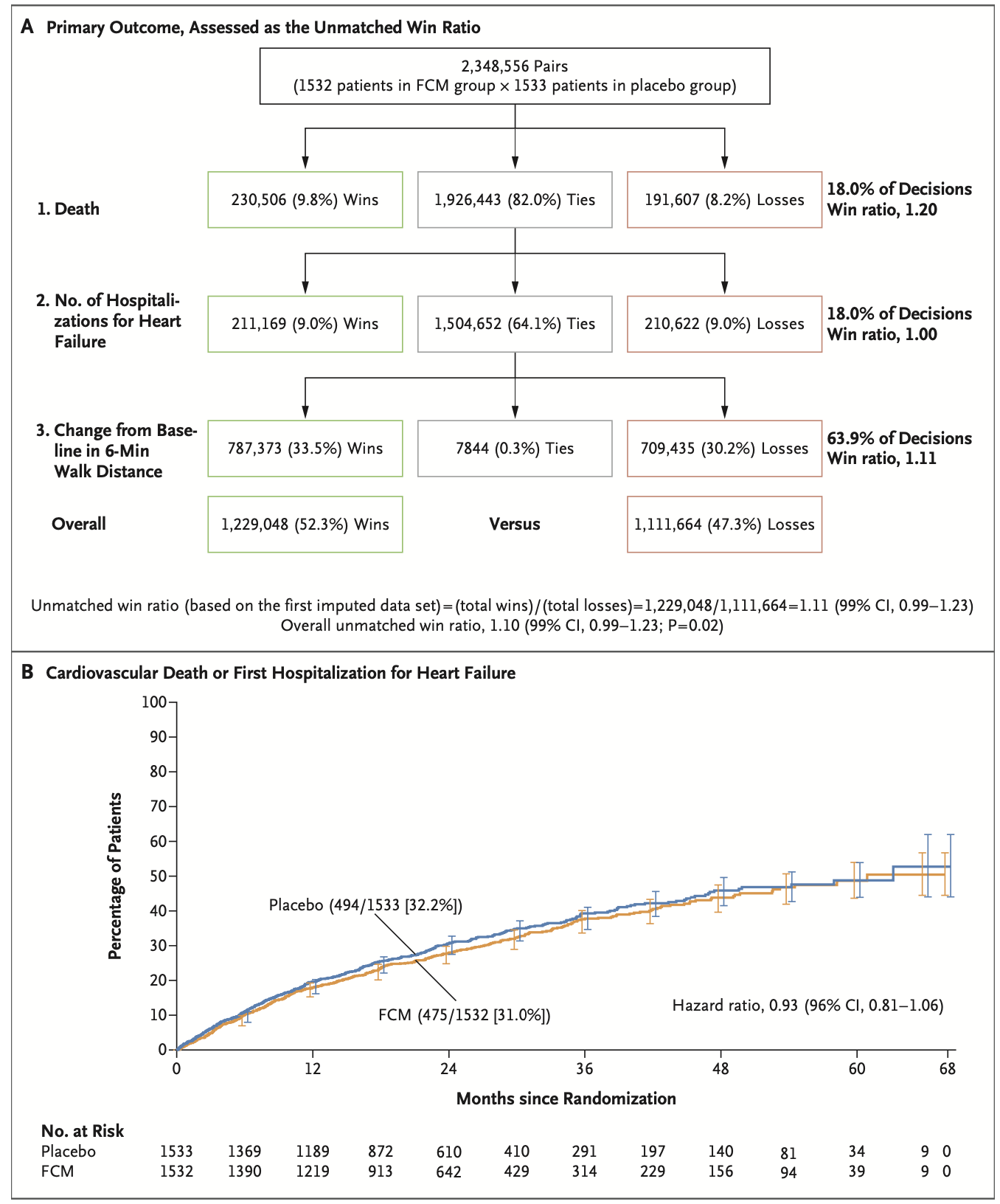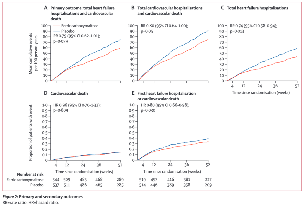 12ヶ月時点で死亡数はカルボキシマルトース第二鉄群で131名(8.6%)、プラセボ群で158名(10.3%)。心不全入院はそれぞれ297名、332名。6分間歩行の距離の変化は8±60m、4±59m。Win比は1.10(99%CI, 0.99-1.23; P=0.02)で有意差はなかった。