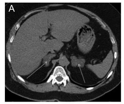 造影効果を嚢胞壁にも、結節にも認めない。嚢胞壁に造影効果を認める(rim enhancement)場合は慢性炎症を示唆する。