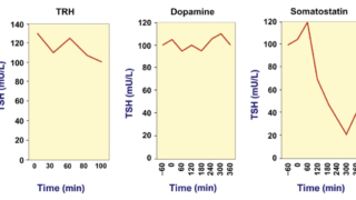 ソマトスタチンアナログを投与するとTSHのピークや周波数が減少。夜間のピークも消失する。長期間ソマトスタチンアナログを投与しても甲状腺機能低下症は起こらない。これは甲状腺ホルモンのフィードバックによる代償によるものと考えられる。